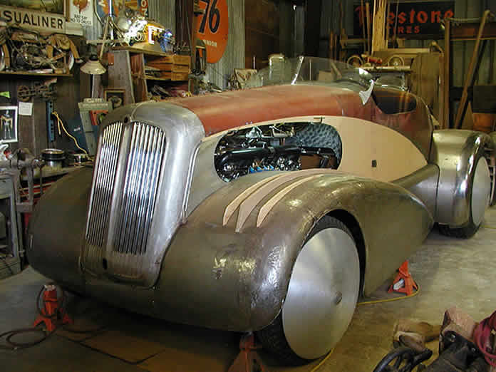 Bertha mocked up in the shop with raw steel fenders and prototyped wood trim. The modified windshield posts came from a Jag 120 roadster.